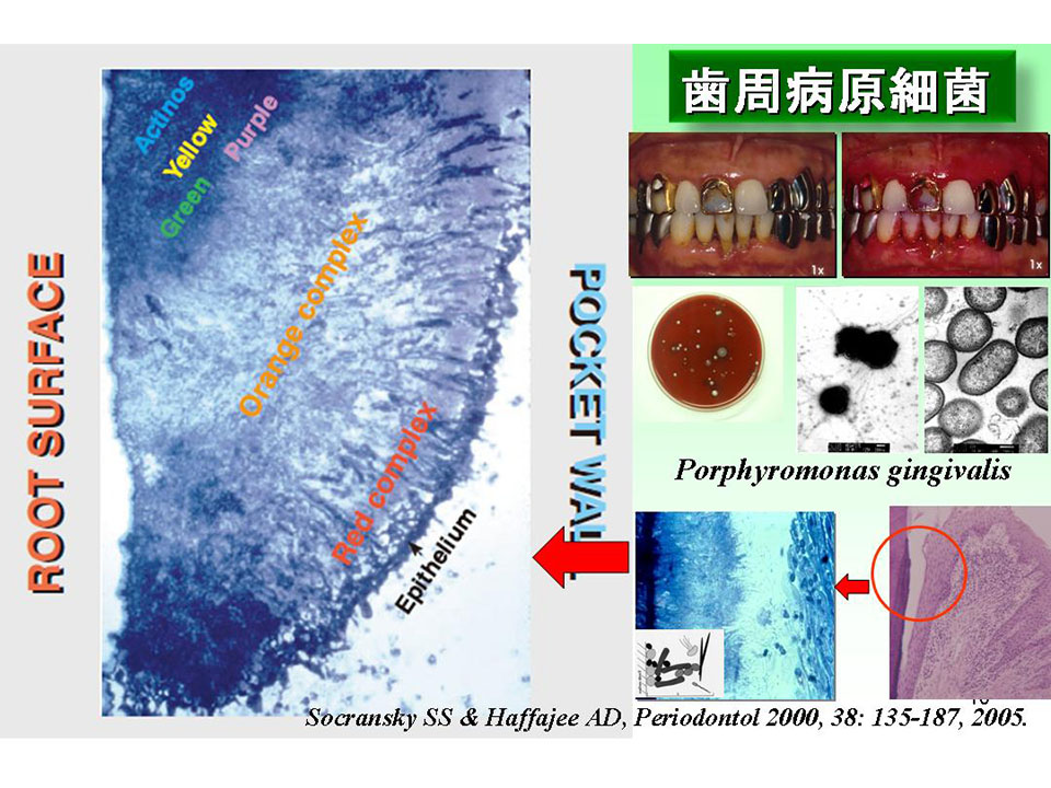 ポケット上皮の表面は非常に小さな潰瘍がたくさんあります。微小潰瘍はご存じのように、上皮が薄くなっています。外のものが組織内に進入しやすいのです。すなわち歯周ポケット内のプラーク細菌や代謝産物が、どんどん体中に入り込んできます。ちょうど掌ぐらいの入口が口腔内に存在していると考えることができます。