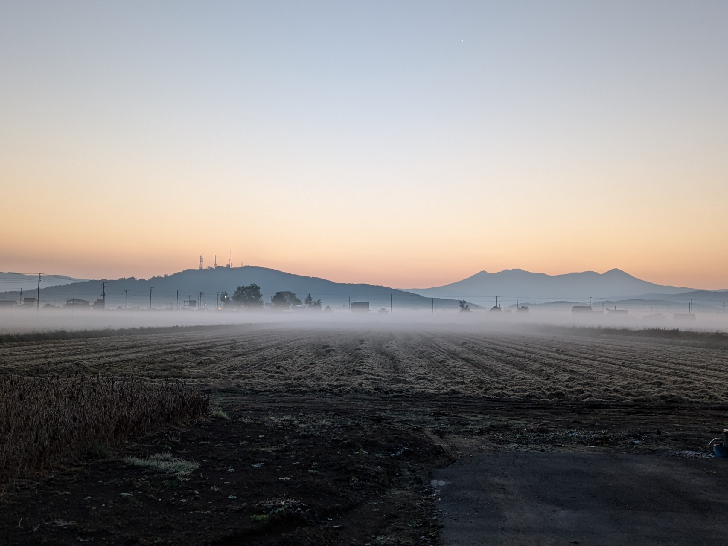 旭川も稲刈りも終わり冬に向かっています。朝テニス前の霞んだ旭山を撮影しました。
